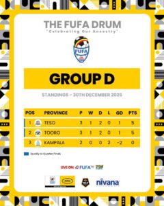 Teso leads Group D with five points same as Tooro who are in second with the same points. Kampala is pointless at the rock bottom.